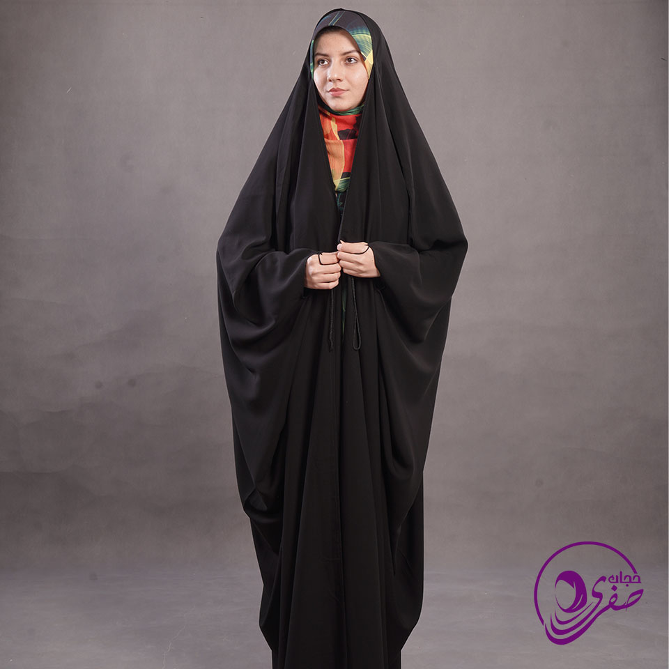 این چادر از دو قسمت بالا تنه و پایین تنه تشکیل شده و تقریبا دو تا مستطیل روی هم قرار میگیرد که از داخل قسمت کمر این ها به هم دو خته میشود و بالای سر آن یک تیکه مستطیلی دارد که از سرخوردن چادر جلوگیری میکند.
